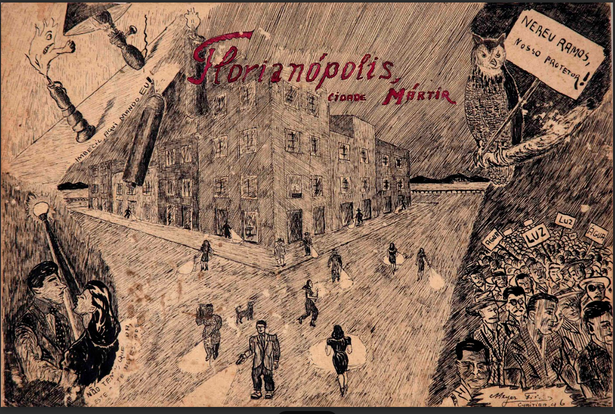Charge em nanquim sobre papel representa vista do centro histórico da cidade de Florianópolis (SC) e pessoas que parecem conduzir lanternas, circundadas por representações de: manifestação popular, casal junto a um poste, coruja com uma placa onde lê-se: "Nereu Ramos, nosso protetor!", pombocas e vela onde lê-se: "Imbecil, aqui mando eu". Possui desenho de dois homens e rascunho de um carro no verso. Obra assinada, datada e com identificação da cidade
