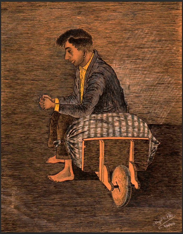 Coleção Coleção Instituto Meyer Filho Item MF.00026 23/01/2023 por Anna Serafim   Documento 00026 Baixar Metadados Miniatura Nº de registroMF.00026Outros registros Outros registros 014R Localização no InstitutoMAPOTECA 1 - GAV. 1ColeçãoII. Artes plásticasTipoDesenhoTítuloNIAutoriaMeyer FilhoLocal*Florianópolis (SC)Data Data 04/10/1956 Década 1950 Ano 1956 DescriçãoDesenho em nanquim e lápis de cor sobre papel de homem sentado em um carrinho de mão. Obra assinada e datada.IndexadoresFigura masculina | RetratoDimensão32,2 x 41,1 cmSuportePapelTécnicaNanquim e lápis de cor sobre papelBordaNão se aplicaColorNão se aplicaEstado de conservaçãoBomDanos causados porAdesivo aderido | Manchas | Ondulações | Rasgo | Vincos e dobrasProcedimentosAcondicionado | Com conservação curativa | Digitalizado | HigienizadoForma de aquisiçãoLicença de uso de direitos autorais gratuitaProcedência*Família Meyer FilhoData de aquisição Data NI ObservaçõesA obra passou por planificação das bordas com papel acid free resultado do projeto de Conservação e Restauro das Obras em Papel de Meyer Filho realizado em 2016.Registrado porAnna Julia Borges SerafimData de registro30/01/2023Condições de ReproduçãoTodos os direitos reservados. Para utilização da imagem solicitar autorização ao Instituto Meyer Filho. Continue navegando MF.00027 MF.00352 Voltar para a página de itens
