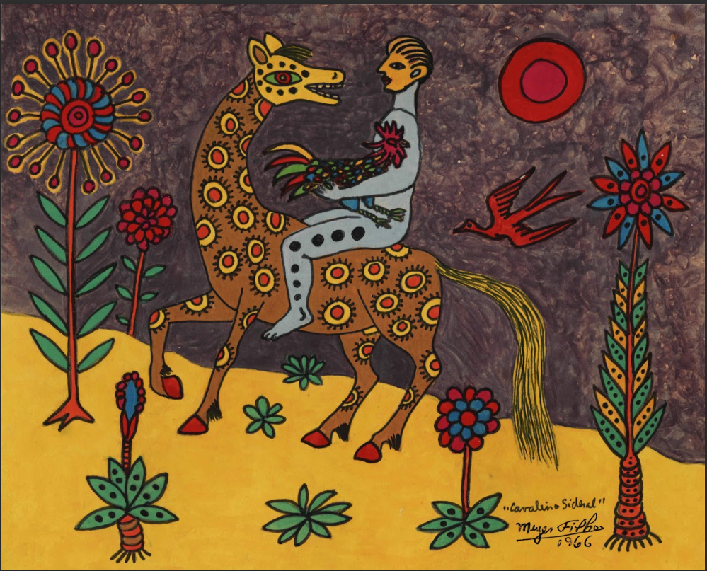 Desenho em caneta hidrográfica, nanquim e guache sobre papel intitulado "Cavaleiro Sideral". A composição apresenta um ser quadrupede e figura masculina segurando galo em um fundo com sol, flores e vegetação nas cores predominantes amarelo, vermelho e cinza. Obra assinada e datada pelo artista em nanquim. No verso observa-se esboço de desenho a lápis grafite e a impressão digital do artista junto as inscrições "m/ polegar direito para identificar o m/ desenho no verso desta folha. Meyer Filho 8/8/66".