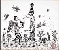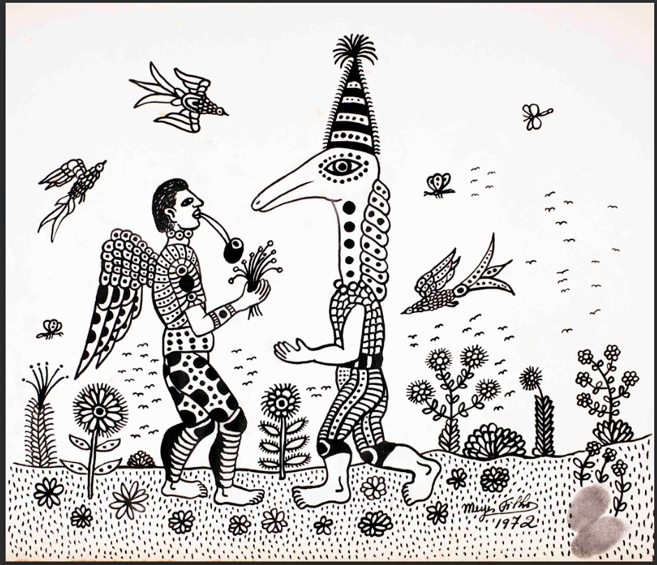 Desenho em nanquim sobre papel cartão de humanoide alado fumando cachimbo e com vegetação nas mãos, ser hibrido com rosto de animal e corpo humano, no entorno observa-se aves e vegetação com flores. Obra datada por ano e assinada com duas digitais do polegar do artista com três flores desenhadas acima.