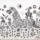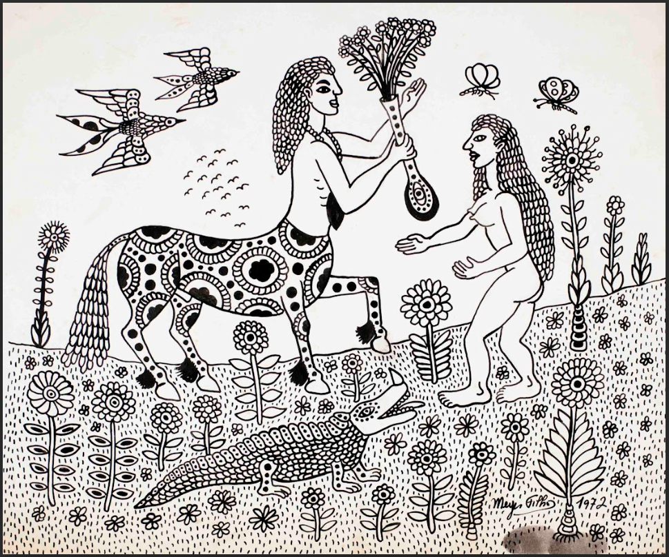 Desenho em nanquim sobre papel cartão de ser hibrido de figura humana com animal quadrupede entregando vaso com flores para uma figura feminina, no entorno observa-se jacaré, borboletas, aves e vegetação com flores. Obra datada por ano e assinada com duas digitais do polegar do artista com uma flor desenhada acima.