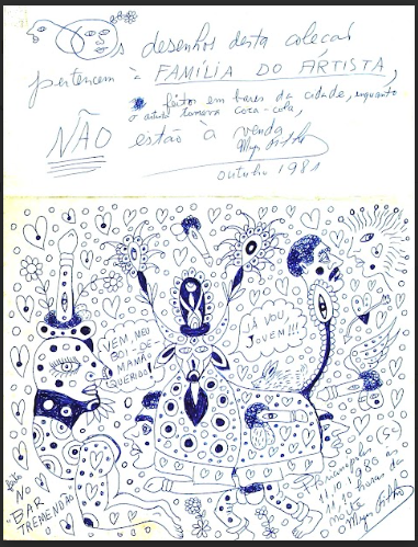 Desenho em caneta esferográfica sobre papel intitulado "No bar "Tremendão" e realizado no verso de folha de calendário. A composição apresenta boi de mamão, seres híbridos e membros fálicos com balões de comentário. Obra assinada e datada. Na parte superior vê-se a inscrição "Os desenhos desta coleção pertencem à família do artista, feito em bares da cidade, enquanto o artista tomava Coca-Cola, não estão à venda, outubro 1981."