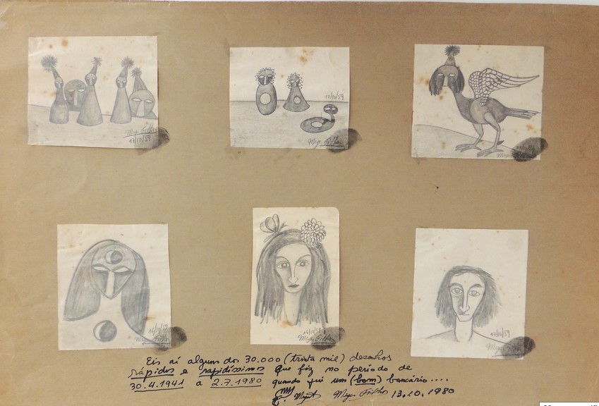 Colagem de desenhos em papel do tipo cartão. Apresenta diferentes representações como figuras femininas e seres híbridos, possivelmente da série intitulada pelo artista de Cósmico ou Sideral, realizados em grafite em 1959. Sobre os desenhos observa-se a impressão digital do artista e inscrições. Colagem datada de 13/10/1980 e com as assinaturas de Meyer artista e cidadão.
