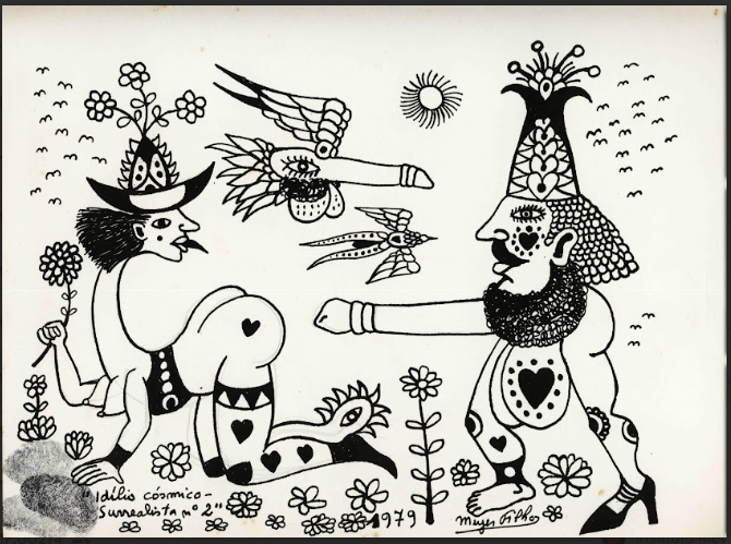 Desenho em nanquim sobre papel de temática erótica intitulado Idílio Cósmico - "Surrealista nº2". A composição possui dois seres híbridos, um deles com membro fálico, aves e vegetação com flores. Obra datada, assinada e com impressão digital do artista.