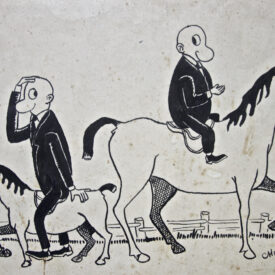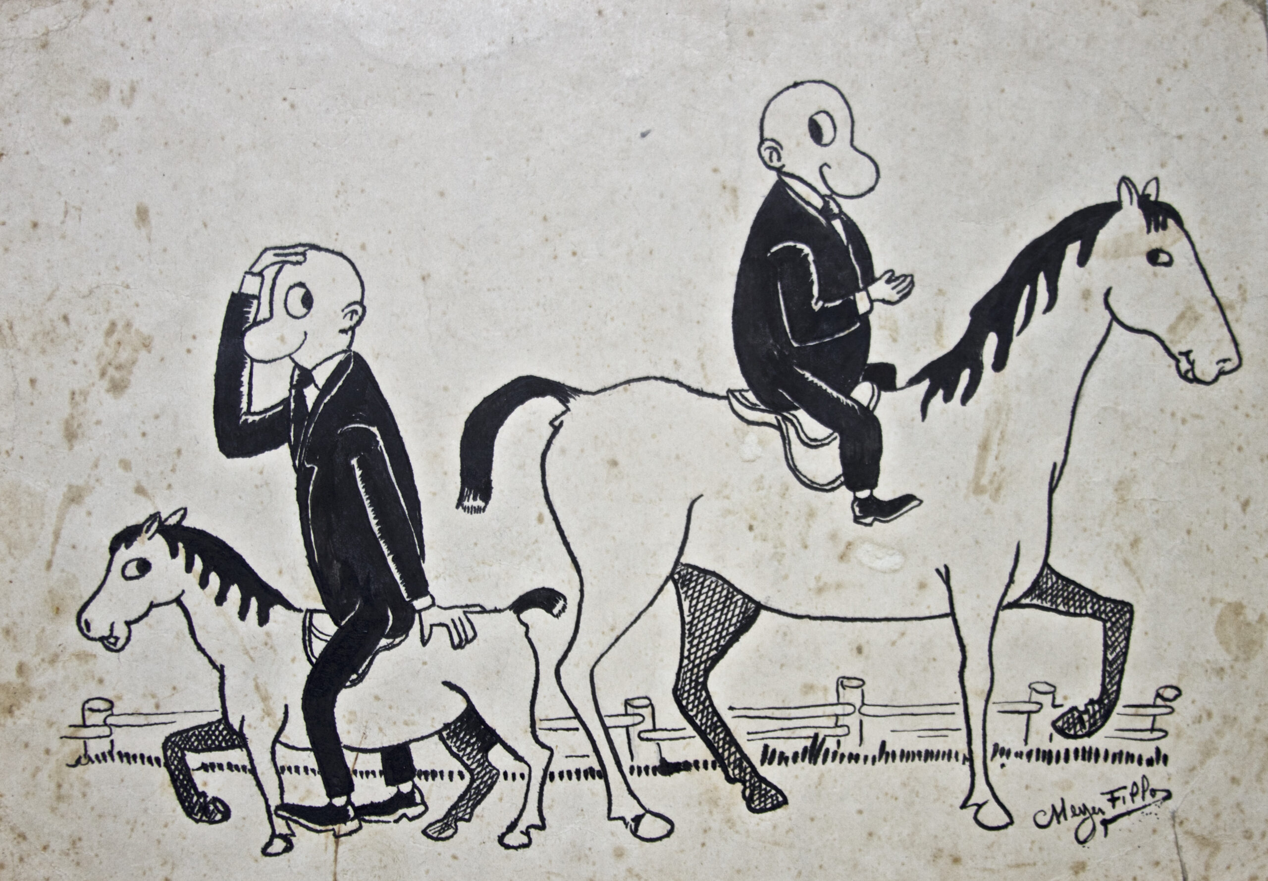 Charge original em nanquim sobre papel, provavelmente publicada em jornal não identificado. A composição apresenta dois personagens e dois cavalos em lados opostos. Obra assinada pelo artista em nanquim.