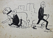 Charge original em nanquim sobre papel, provavelmente publicada em jornal não identificado. A composição apresenta dois personagens e dois cachorros em lados opostos. Obra assinada pelo artista em nanquim.
