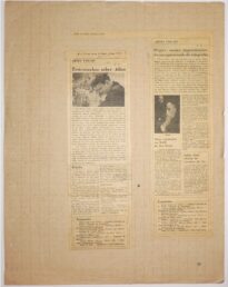 MF.02222.7 Recorte de jornal de 10/07/1960, aderido a uma folha pautada, aderida a outra folha sulfite com destaque para coluna “Artes Visuais”, com autoria de Mário Barata, com matéria intitulada “Exposições da Semana”. (17,7 x 27,4 cm)