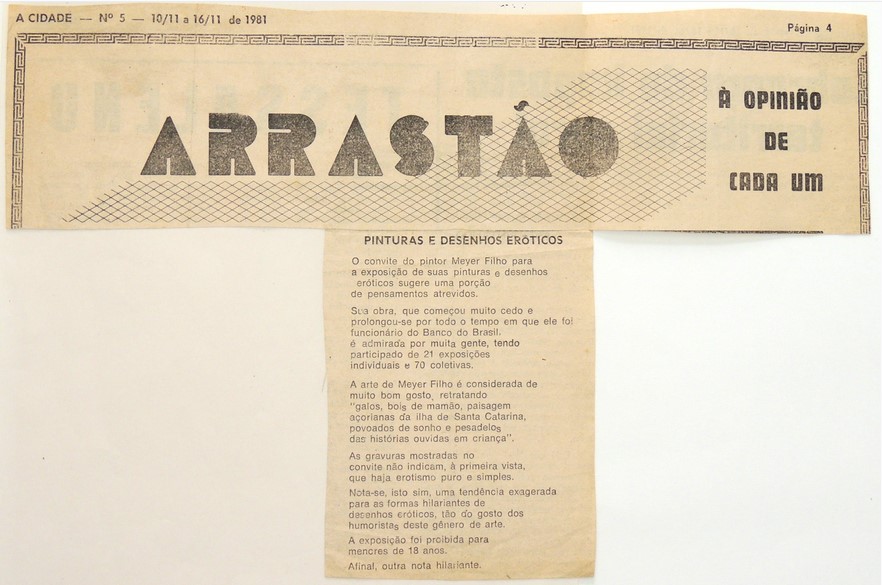 Coleção Coleção Instituto Meyer Filho Item MF.02254 01/11/2022 por Ana Julia Patricio   Documento MF.02254 Baixar Metadados Miniatura Nº de registroMF.02254Outros registros Outros registros NI Outros registros NI Localização no InstitutoMAPOTECA 1 - GAV. 8 - PASTA 14ColeçãoIII. PeriódicosTipoJornalTítuloA cidade (SC) 1981AutoriaNILocal*Florianópolis (SC) | São Paulo (SP)Data Data 10/11/1981 Década 1980 Ano 1981 DescriçãoRecorte de jornal, aderido a uma folha sulfite, de 10/11/1981 com destaque para matéria da coluna "Arrastão" intitulada: "Pinturas e desenhos eróticos". Possui fotocópia MF.02254.1 (26,6 x 18,5 cm)IndexadoresA Cidade | Arrastão | Eróticos | JornalDimensão32,7 x 21,5 cmSuportePapel jornalTécnicaImpressão sobre papel jornalBordaNão se aplicaColorNão se aplicaEstado de conservaçãoBomDanos causados porAmarelecimento | Manchas | Sujidades | Vincos e dobrasProcedimentosAcondicionado | Digitalizado | HigienizadoForma de aquisiçãoLicença de uso de direitos autorais gratuitaProcedência*Família Meyer FilhoData de aquisição Data NI Registrado porAna Julia Vieira PatrícioData de registro01/11/2022Condições de ReproduçãoTodos os direitos reservados. Para utilização da imagem solicitar autorização ao Instituto Meyer Filho. Continue navegando MF.02227 MF.02253 Voltar para a página de itens
