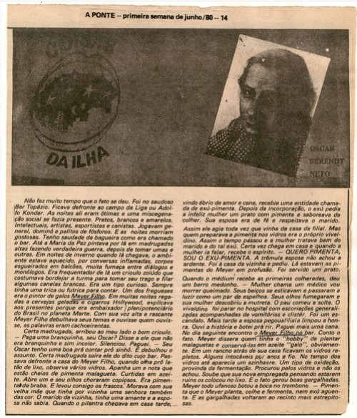 Coleção Coleção Instituto Meyer Filho Item MF.02257 17/11/2022 por Anna Serafim   Documento MF.02257 Baixar Metadados Miniatura Nº de registroMF.02257Localização no InstitutoMAPOTECA 1 - GAV. 8 - PASTA 10ColeçãoIII. PeriódicosTipoJornalTítuloA Ponte (1980) - com grifoAutoriaNILocal*Florianópolis (SC)Data Década 1980 Ano 1980 Mês e ano Junho de 1980 DescriçãoRecorte de jornal, aderido a uma folha sulfite, de junho de 1980 com destaque para matéria "Coisas da Ilha" por Oscar Berendt Neto. Possui o nome do artista sublinhado em lápis grafite.IndexadoresA Ponte | Oscar Berendt NetoDimensão18 x 21,2 cmSuportePapel jornalTécnicaImpressão sobre papel jornalBordaNão se aplicaColorNão se aplicaEstado de conservaçãoBomDanos causados porAmarelecimento | Manchas | Sujidades | Vincos e dobrasProcedimentosAcondicionado | Digitalizado | HigienizadoForma de aquisiçãoLicença de uso de direitos autorais gratuitaProcedência*Família Meyer FilhoData de aquisição Data NI Registrado porAnna Julia Borges SerafimData de registro17/11/2022Condições de ReproduçãoTodos os direitos reservados. Para utilização da imagem solicitar autorização ao Instituto Meyer Filho. Continue navegando MF.02220 MF.02246 Voltar para a página de itens