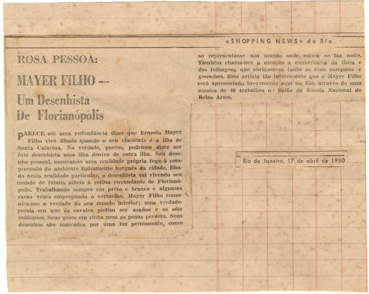 Coleção Coleção Instituto Meyer Filho Item MF.02267 10/11/2022 por Ana Julia Patricio   Documento MF.02267 Baixar Metadados Miniatura Nº de registroMF.02267Localização no InstitutoMAPOTECA 1 - GAV. 7 - PASTA 5ColeçãoIII. PeriódicosTipoJornalTítuloShopping News (RJ) 1960AutoriaNILocal*Rio de Janeiro (RJ)Data Data 17/04/1960 Década 1960 Ano 1960 DescriçãoRecorte de jornal, aderido a uma folha pautada, aderida a outro folha sulfite, de 17/04/1960 com destaque para matéria com autoria de Rosa Pessoa, intitulada "Mayer Filho - Um desenhista de Florianópolis"IndexadoresJornal | Rosa Pessoa | Shopping NewsDimensão19,5 x 15,7 cmSuportePapel jornalTécnicaImpressão sobre papel jornalBordaNão se aplicaColorNão se aplicaEstado de conservaçãoBomDanos causados porAmarelecimento | Manchas | Sujidades | Vincos e dobrasProcedimentosAcondicionado | Digitalizado | HigienizadoForma de aquisiçãoLicença de uso de direitos autorais gratuitaProcedência*Família Meyer FilhoData de aquisição Data NI Registrado porAna Julia Vieira PatrícioData de registro10/11/2022Condições de ReproduçãoTodos os direitos reservados. Para utilização da imagem solicitar autorização ao Instituto Meyer Filho. Continue navegando MF.02280 MF.02288 Voltar para a página de itens