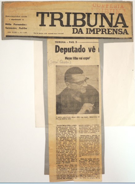 Coleção Coleção Instituto Meyer Filho Item MF.02269 25/11/2022 por Anna Serafim   Documento MF.02269 Baixar Metadados Miniatura Nº de registroMF.02269Localização no InstitutoMAPOTECA 1 - GAV. 8 - PASTA 8ColeçãoIII. PeriódicosTipoJornalTítuloTribuna da Imprensa (RJ) 1967AutoriaNILocal*Rio de Janeiro (RJ)Data Data 09/10/1967 Década 1960 Ano 1967 DescriçãoRecorte de jornal de 09/10/1967, aderido a um papel cartão, aderido a uma folha sulfite com destaque para a matéria "Meyer Filho vai expor". Apresenta foto do artistaIndexadoresJornal | Meyer Filho | Tribuna da ImprensaSuportePapel de jornalTécnicaImpressão sobre papel jornalBordaNão se aplicaColorNão se aplicaEstado de conservaçãoBomDanos causados porAmarelecimento | Manchas | Papel aderido | Vincos e dobrasProcedimentosAcondicionado | Digitalizado | HigienizadoForma de aquisiçãoLicença de uso de direitos autorais gratuitaProcedência*Família Meyer FilhoData de aquisição Data NI Registrado porAna Julia Vieira PatrícioData de registro16/11/2022Condições de ReproduçãoTodos os direitos reservados. Para utilização da imagem solicitar autorização ao Instituto Meyer Filho. Continue navegando MF.02285 MF.02642 Voltar para a página de itens