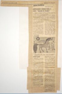 Recorte de jornal aderido a uma folha pautada, aderida a outra folha sulfite, de 30/06/1960 com destaque para coluna "Artes Plásticas" de Hildebrando Giudice com matéria intitulada "Apresentação: Pintor Meyer Filho". Apresenta reprodução de obra do artista. Possui fotocópia de parte da reportagem MF.02271.1 (21,5 x 32,8 cm)