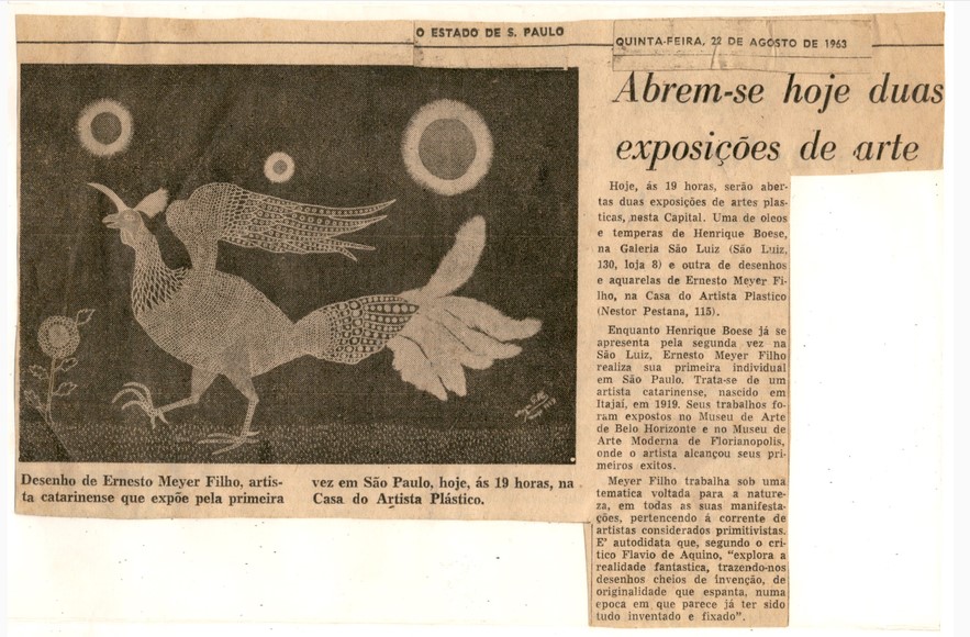 Coleção Coleção Instituto Meyer Filho Item MF.02277 13/10/2022 por Ana Julia Patricio   Documento MF.02277 Baixar Metadados Miniatura Nº de registroMF.02277Localização no InstitutoMAPOTECA 1 - GAV. 8 - PASTA 11ColeçãoIII. PeriódicosTipoJornalTítuloO Estado de São Paulo (SP) 1963AutoriaNILocal*São Paulo (SP)Data Data 22/08/1963 Década 1960 Ano 1963 DescriçãoRecorte aderido a uma folha sulfite de 22/08/1963 com matéria intitulada "Abrem-se hoje duas exposições de arte".IndexadoresJornal | O Estado de São PauloDimensão21,4 x 14,1 cmSuportePapel jornalTécnicaImpressão sobre papel jornalBordaNão se aplicaColorNão se aplicaEstado de conservaçãoBomDanos causados porAmarelecimento | Manchas | Sujidades | Vincos e dobrasProcedimentosAcondicionado | Digitalizado | HigienizadoForma de aquisiçãoLicença de uso de direitos autorais gratuitaProcedência*Família Meyer FilhoData de aquisição Data NI Registrado porAna Julia Vieira PatrícioData de registro13/10/2022Condições de ReproduçãoTodos os direitos reservados. Para utilização da imagem solicitar autorização ao Instituto Meyer Filho. Continue navegando MF.02232 MF.02276 Voltar para a página de itens
