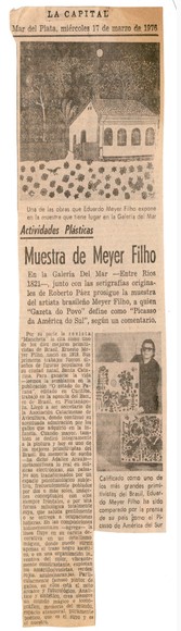 Coleção Coleção Instituto Meyer Filho Item MF.02285 25/11/2022 por Anna Serafim   Documento MF.02285 Baixar Metadados Miniatura Nº de registroMF.02285Localização no InstitutoMAPOTECA 1 - GAV. 7 - PASTA 5ColeçãoIII. PeriódicosTipoJornalTítuloLa Capital (AR) 1976AutoriaNILocal*Mar del Plata (ARG)Data Data 17/03/1976 Década 1970 Ano 1976 DescriçãoRecorte de jornal de 17/03/1976 com destaque para a matéria intitulada "Muestra de Meyer Filho". Apresenta reprodução de obra.IndexadoresMar del Plata (AR) | Meyer FilhoSuportePapel de jornalTécnicaImpressão sobre papel jornalBordaNão se aplicaColorNão se aplicaEstado de conservaçãoBomDanos causados porAmarelecimento | Manchas | Vincos e dobrasProcedimentosAcondicionado | Digitalizado | HigienizadoForma de aquisiçãoLicença de uso de direitos autorais gratuitaProcedência*Família Meyer FilhoRegistrado porAna Julia Vieira PatrícioData de registro14/11/2022Condições de ReproduçãoTodos os direitos reservados. Para utilização da imagem solicitar autorização ao Instituto Meyer Filho. Continue navegando MF.02215 MF.02283 Voltar para a página de itens