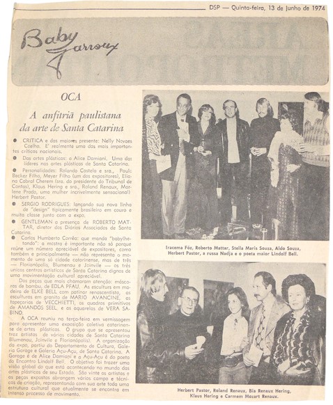 Página de jornal de 13/06/1974 com matéria em destaque intitulada "A anfitriã paulistana da arte de Santa Catarina" com foto de artistas catarinenses: Iracema Fóz, Roberto Mattar, Stella Maris Souza, Aldo Souza, Herbert Pastor, Lindolf Bell, Roland Renaux, Bia Renaux Herinf, Klaus Hering e Carmem Mozart Reanux.