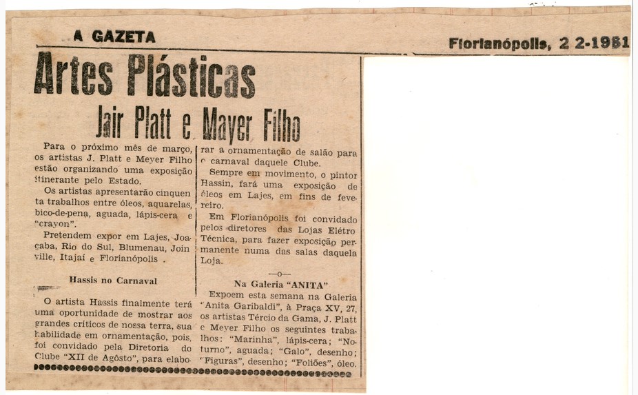 Coleção Coleção Instituto Meyer Filho Item MF.02322 18/11/2022 por Anna Serafim   Documento MF.02322 Baixar Metadados Miniatura Nº de registroMF.02322Localização no InstitutoMAPOTECA 1 - GAV. 8 - PASTA 11ColeçãoIII. PeriódicosTipoJornalTítuloA Gazeta (SC) 1981AutoriaNILocal*Florianópolis (SC)Data Data 02/02/1981 Década 1980 Ano 1981 DescriçãoRecorte de jornal de 02/02/1981, aderido à papel sulfite, da coluna "Artes Plásticas" com matéria intitulada "Jair Platt e Mayer Filho" sobre exposição itinerante dos artistas por Santa Catarina.IndexadoresA Gazeta | Exposição | Jair Platt | Meyer FilhoDimensão21,6 x 13,3 cmSuportePapel jornalTécnicaImpressão sobre papel jornalBordaNão se aplicaColorNão se aplicaEstado de conservaçãoBomDanos causados porAmarelecimento | Manchas | Sujidades | Vincos e dobrasProcedimentosAcondicionado | Digitalizado | HigienizadoForma de aquisiçãoLicença de uso de direitos autorais gratuitaProcedência*Família Meyer FilhoData de aquisição Data NI Registrado porAnna Julia Borges SerafimData de registro18/11/2022Condições de ReproduçãoTodos os direitos reservados. Para utilização da imagem solicitar autorização ao Instituto Meyer Filho. Continue navegando MF.02323 MF.02321 Voltar para a página de itens