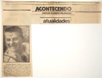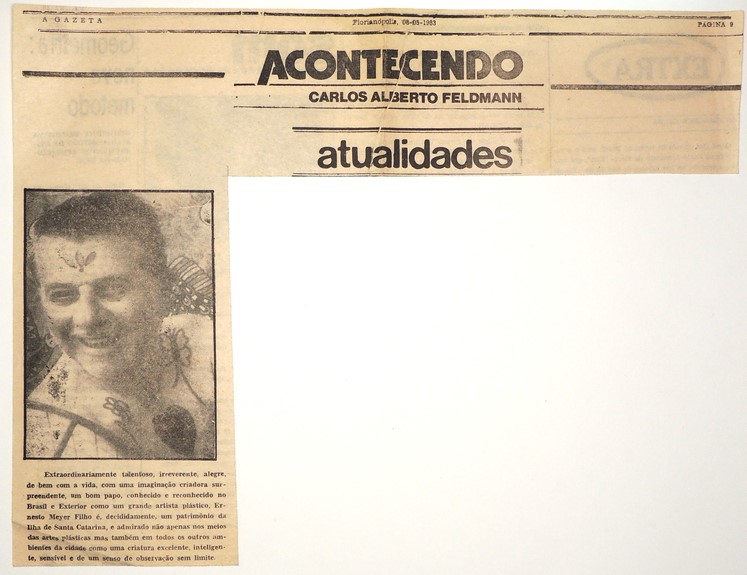 MF.02324.4 Recorte de jornal de 08/05/1983, p.9, coluna "Acontecendo" assinada por Carlos Alberto Feldmann com nota sobre Meyer Filho e reprodução de fotografia do artista (32,9 x 29 cm).