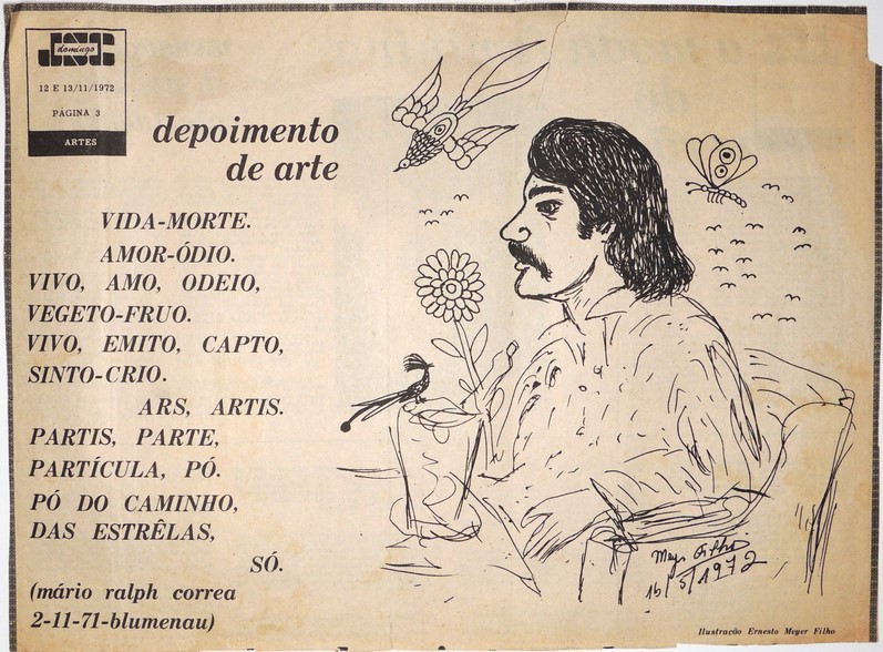 MF.02326.4 Recorte de jornal de 12/11 e 13/11/1972, p.3, com ilustração de Mário Ralph Corrêa realizada por Meyer Filho (36,5 x 27,2 cm).