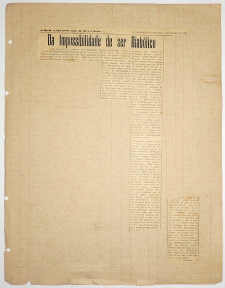 MF.02367.2 Recorte de jornal de 28/10/1959 com a crônica "Da impossibilidade de ser Diabólico" assinada por João Evangelista (25,4 x 33,1 cm). Possui um outro exemplar MF.02367.2.1 (25,6 x 36,6 cm) e fotocópia MF.02372.2.2 (27,8 x 43 cm)