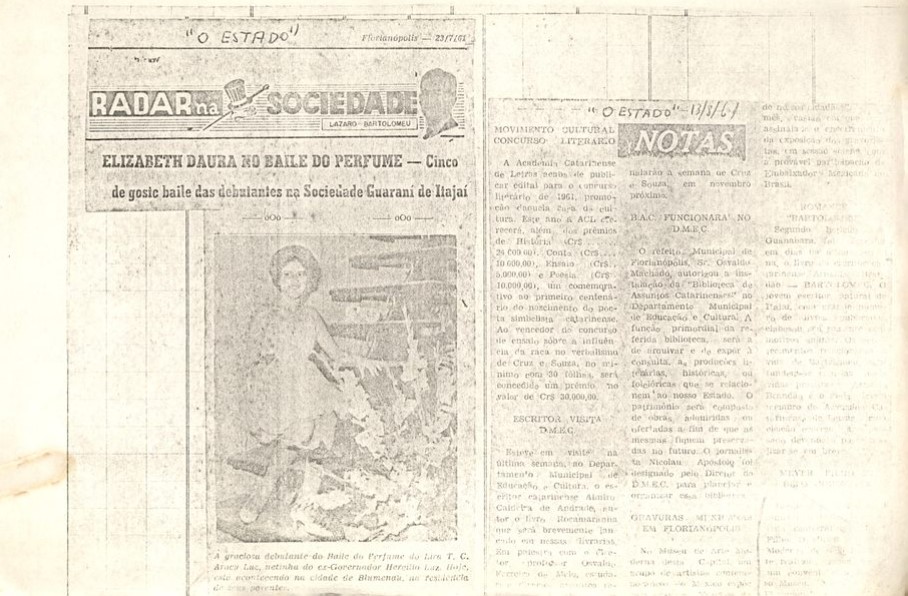 MF.02369.1 Recorte de jornal, aderido a papel sulfite, de 11/07/1961, com destaque para matéria intitulada "Uma menina de Itajaí (um livro de recordações e muita ternura)" assinada por Osvaldo Melo. (20,8 x 28,7 cm).