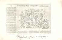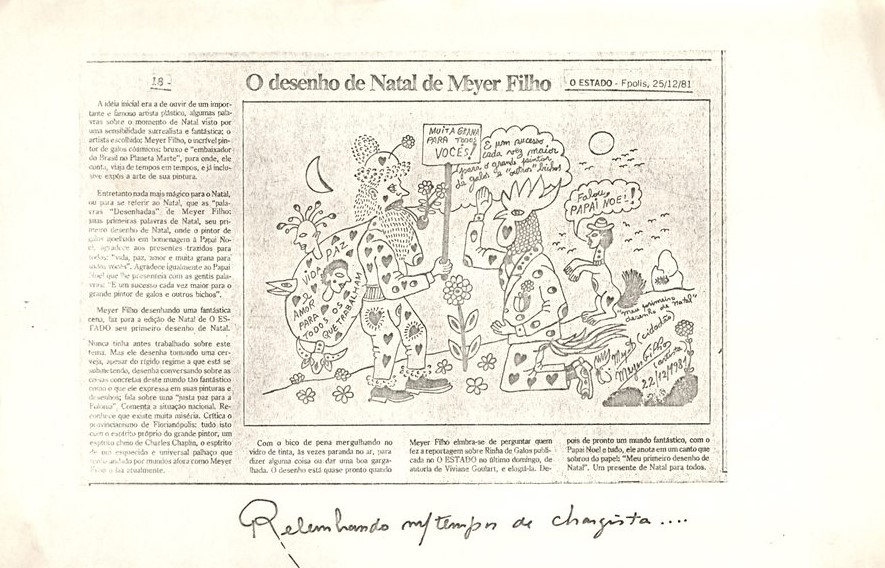 MF.02385.2 Recorte de jornal de 25/12/1981, p.18, com destaque para a matéria "O desenho de Natal de Meyer Filho". Possui reprodução de obra do artista (23 x 15,2 cm). Possui fotocópia MF.02385.2.1 (32,8 x 21,5 cm)
