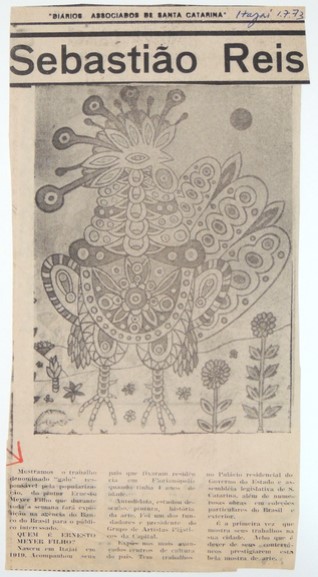 MF.02396.1 Recorte de jornal de 01/07/1973 com matéria de autoria de Sebastião Reis sobre quem é Meyer Filho. Apresenta reprodução de obra. Possui inscrição do artista com data. (13,1 x 25,3 cm)
