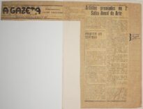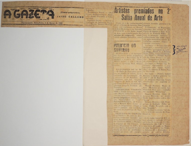 MF.02402.1 Recorte de jornal de 06/03/1959 aderido a uma folha sulfite com destaque para matéria intitulada "Artistas premiados no 2º Salão Anual de Arte". Possui inscrição feita pelo artista "os "moços" não gostaram..." (37 x 27,7 cm)