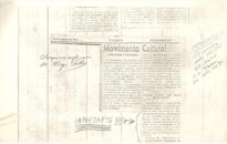 MF.02404.7 Recorte de jornal de 16/08/1961, aderido a uma folha pautada, aderida a uma folha sulfite da coluna "Movimento Cultural" com trecho sobre Meyer Filho em Belo Horizonte. Possui sublinhado em partes do trecho e inscrição "A gazeta 16.8.61" (13,8 x 18,2 cm). Possui fotocópia MF.02404.7.1 (32,9 x 21,6 cm)
