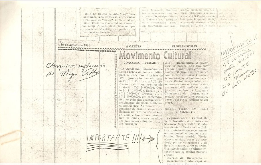 MF.02404.2 Recorte de jornal de 05/05/1961 aderido a uma folha sulfite da coluna "Artes Plásticas" com autoria de Rivera sobre exposição do artista no GAPF. Possui inscrição do artista "A GAZETA 5/5/61" (11,7 X 37,7 cm). Possui fotocópia MF.02404.2.1 com grifo a caneta esferográfica vermelha "Exemplo movimentação da arte pelo Grupo de Artistas Plásticos de Florianópolis" (27,9 x 42,9 cm). MF.02404.2.2 Fotocópia de recorte de Jornal Tribuna da Imprensa, ano 1, nº 27, de 08/05/1961, com destaque para matéria intitulada "TRIBUNA CATARINENSE: dentro do 1º Festival de Florianópolis promove:", que cita Mostra de Meyer Filho, possui anotação do artista em caneta esferográfica vermelha (27,9 x 42,9 cm)
