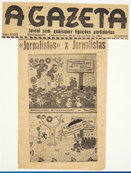 Coleção Coleção Instituto Meyer Filho Item MF.02405 02/12/2022 por Ana Julia Patricio   Documento MF.02405 Baixar Metadados Miniatura Nº de registroMF.02405Localização no InstitutoMAPOTECA 1 - GAV. 8 - PASTA 11ColeçãoIII. PeriódicosTipoJornalTítuloA Gazeta (SC) 1962 - com grifoAutoriaNILocal*Joinville (SC)Data Data 29/11/1962 Década 1960 Ano 1962 DescriçãoRecorte de jornal de 29/11/1962 com charge de Meyer Filho "Jornalistas x Jornalistas". Possui marcação feita pelo artista na chargeIndexadoresA Gazeta | Charge | JornalDimensão15,6 x 20,4 cmSuportePapel de jornalTécnicaImpressão sobre papel jornalBordaNão se aplicaColorNão se aplicaEstado de conservaçãoBomDanos causados porAmarelecimento | OxidaçãoProcedimentosAcondicionado | Digitalizado | HigienizadoForma de aquisiçãoLicença de uso de direitos autorais gratuitaProcedência*Família Meyer FilhoData de aquisição Data NI Registrado porAna Julia Vieira PatrícioData de registro02/12/2022Condições de ReproduçãoTodos os direitos reservados. Para utilização da imagem solicitar autorização ao Instituto Meyer Filho. Continue navegando MF.02403 MF.02406 Voltar para a página de itens