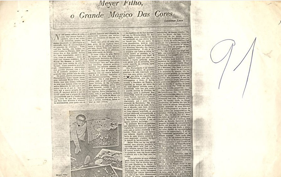 MF.02414.1: Página de jornal aderida a uma folha sulfite de 12/06/1976 com matéria intitulada "Meyer Filho, o Grande Mágico Das Cores" com autoria de Lausimar Laus. Possui fotografia do artista com suas obras. Apresenta inscrição do artista com a data do jornal e "Caderno de sábado". Possui outros exemplares: MF.02414.1.1, MF.02414.1.2 e MF.02414.1.3 e fotocópia MF.02414.1.4 com anotação a caneta esferográfica do artista "91" (32,7 x 21,5 cm) e fotocópia MF.02414.1.5 com inscrição do artista em caneta esferográfica azul com informações sobre o jornal (32,8 x 21,6 cm).