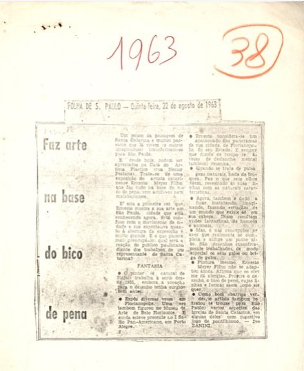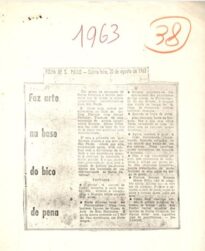 MF.02418.7 Recorte de jornal, aderido a uma folha sulfite, de 23/08/1963 com destaque para matéria intitulada "Faz arte na base do bico de pena". Possui fotografia do artista com sua obra (19 x 27,8 cm). Possui fotocópia MF.02418.7.1 com inscrição do artista em caneta esferográfica vermelha e lápis de cor vermelho (18,7 x 24,7 cm).