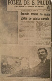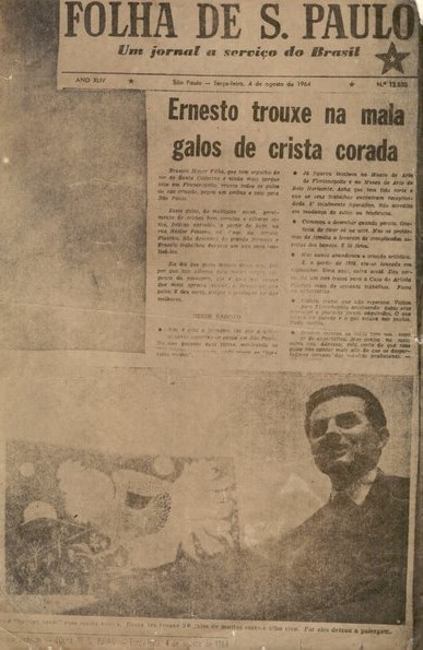 MF.02419.5 Recorte de jornal de 04/08/1964, ano XLIV, nº 12.833, com destaque para matéria "Ernesto trouxe na mala galos de crista corada" assinada por Ivo Zanini. Possui nome do artista sublinhado a lápis (23,5 x 33,3 cm). Possui fotocópia MF.02419.5.1 aderida a um papel sulfite com inscrição do artista: "2ª Expô do artista em S. Paulo 1964" (21,4 x 32,8 cm)