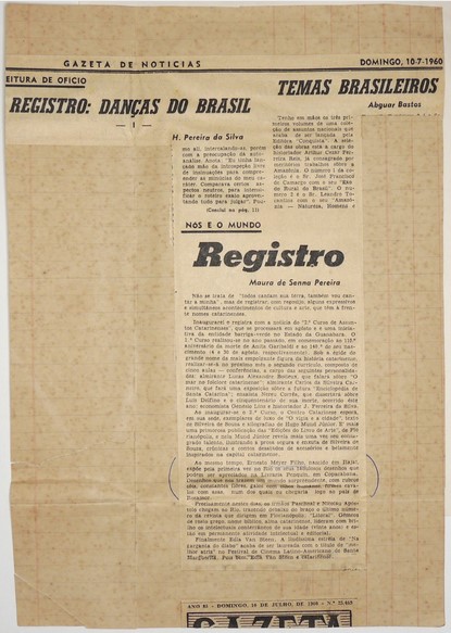 MF.02422.1: Recorte de jornal, aderido a papel sulfite, Jornal Gazeta de Notícias, ano 85, nº 25469, de 10/07/1960, com destaque para matéria intitulada "Registro" de autoria de Maura de Senna Pereira, que cita Meyer Filho. Possui seta destacando parte do texto em caneta esferográfica preta (20,4 x 27,3 cm). Possui outro recorte do mesma matéria (22,1 x 31,9) (MF.02422.1.1).