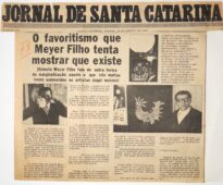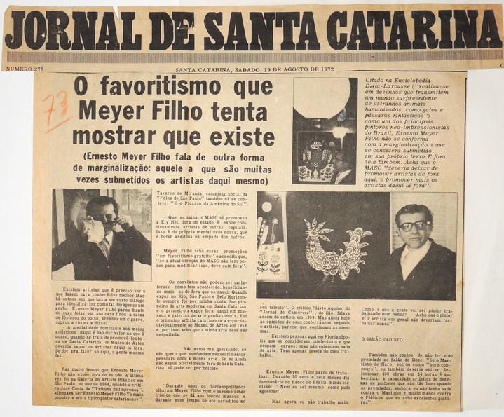 MF.02428.1 Recorte, aderido a papel sulfite, do Jornal de Santa Catarina, nº 278, de 19/08/1972, com destaque para matéria intitulada "O favoritismo que Meyer Filho tenta mostrar que existe", com fotografias do artista e obras. Possui inscrição do artista em lápis de cera vermelho. (32,3 x 26,8 cm). Possui fotocópia MF.02428.1.1 (21,5 x 32,8 cm)