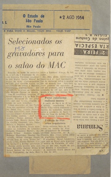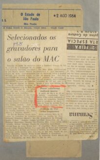 MF.2440.1 Recorte de jornal aderido à papel cartão de 02/08/1964, republicado pelo Lux Jornal, de matéria intitulada "Selecionados os gravadores para o salão do MAC" sobre exposição na Casa do Artista Plástico com reprodução de obra de Meyer Filho. Possui destaque em lápis de cera nas bordas do texto (14,1 x 31,2 cm).