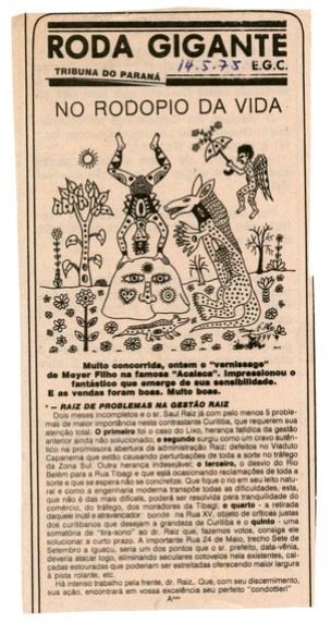 MF.2441.1 Recorte de jornal de 14/05/1975, com matéria intitulada "No Rodopio da Vida" sobre vernissage na Galeria Acaiaca (9,1 x 18,3 cm). Possui data inscrita a caneta e outro exemplar (MF.02441.1.1).