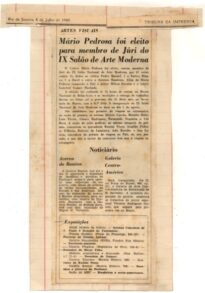Coleção Coleção Instituto Meyer Filho Item MF.02442 29/11/2022 por Anna Serafim   Documento MF.02442 Baixar Metadados Miniatura Nº de registroMF.02442Localização no InstitutoMAPOTECA 1 - GAV. 8 - PASTA 10ColeçãoIII. PeriódicosTipoJornalTítuloTribuna da Imprensa (RJ) 1960 - com grifoAutoriaS/A Editora Tribuna da ImprensaLocal*Rio de Janeiro (RJ)Data Data 08/07/1960 Década 1960 Ano 1960 Mês e ano Julho de 1960 DescriçãoRecorte, aderido a papel sulfite, de jornal Tribuna da Imprensa, de 08/07/1960, Coluna Artes Visuais, com destaque para nota de divulgação de exposição de Meyer Filho, na Galeria Penguin. Possui seta destacando parte da nota em grafite.IndexadoresColuna Artes Visuais | Galeria de Arte Moderna da Livraria Penguin | Meyer Filho | Tribuna da ImprensaDimensão18,4 x 2,6 cmSuportePapel de jornalTécnicaImpressão sobre papel jornalColorNão se aplicaEstado de conservaçãoBomDanos causados porAmarelecimento | Marcações | Marcas de cola | Oxidação | Sujidades | Vincos e dobrasProcedimentosAcondicionado | Digitalizado | HigienizadoForma de aquisiçãoLicença de uso de direitos autorais gratuitaProcedência*Família Meyer FilhoData de aquisição Data NI Registrado porAnna Laura Borges SerafimData de registro29/11/2022Condições de ReproduçãoTodos os direitos reservados. Para utilização da imagem solicitar autorização ao Instituto Meyer Filho. Continue navegando MF.02446 MF.02447 Voltar para a página de itens