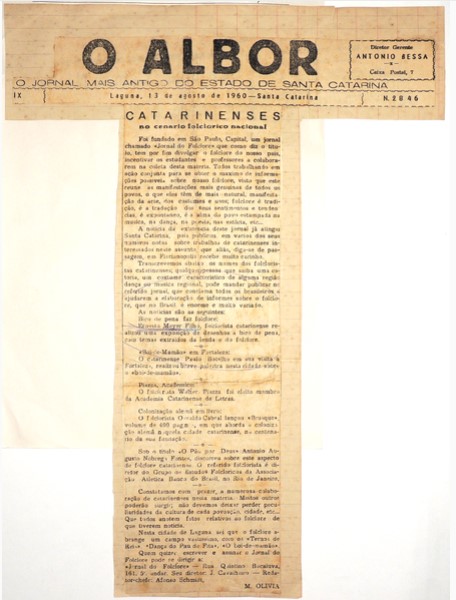 Coleção Coleção Instituto Meyer Filho Item MF.02446 29/11/2022 por Anna Serafim   Documento MF.02446 Baixar Metadados Miniatura Nº de registroMF.02446Localização no InstitutoMAPOTECA 1 - GAV. 7ColeçãoIII. PeriódicosTipoJornalTítuloO Albor (SC) 1960 - com grifoAutoriaNILocal*Laguna (SC)Data Data 13/08/1960 Década 1960 Ano 1960 DescriçãoRecorte de jornal aderido a papel pautado de 13/08/1960, nº 2846, com matéria "Catarinenses: no cenario folclorico nacional" assinado por M. Olivia. Possui nome do artista sublinhado a caneta.IndexadoresExposição | Folclore | Meyer Filho | O AlborDimensão29 x 39,1 cmSuportePapel de jornalTécnicaImpressão sobre papel jornalBordaNão se aplicaColorNão se aplicaEstado de conservaçãoBomDanos causados porAmarelecimento | Manchas | Oxidação | RasgoProcedimentosAcondicionado | Digitalizado | HigienizadoForma de aquisiçãoLicença de uso de direitos autorais gratuitaProcedência*Família Meyer FilhoData de aquisição Data NI Registrado porAnna Julia Borges SerafimData de registro29/11/2022Condições de ReproduçãoTodos os direitos reservados. Para utilização da imagem solicitar autorização ao Instituto Meyer Filho. Continue navegando MF.02441 MF.02442 Voltar para a página de itens