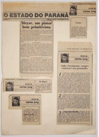 MF.02449.2 Recorte de jornais, aderidos à papel cartão, de notas do "Jornal de Carlos Jung" intituladas "Meyer, um pintor bem primitivista" (07/12/1974) e "Salão Paranaense: sempre restrições ao premiado" (12/12/1974). Possui nome e partes do textos sublinhados em caneta esferográfica (17,8 x 9,5 cm).