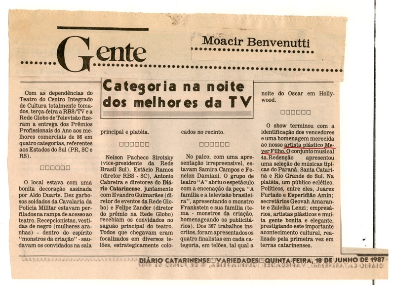 MF.02454.3 Recorte, aderido à papel sulfite, de Jornal Diário Catarinense, Caderno de Variedades, Coluna Gente, assinada por Moacir Benvenutti, de 18/06/1987, com destaque para matéria intitulada "Categoria na noite dos melhores da TV". Possui nome do artista Meyer Filho sublinhado em caneta esferográfica vermelha. (20,7 x 14,6 cm).