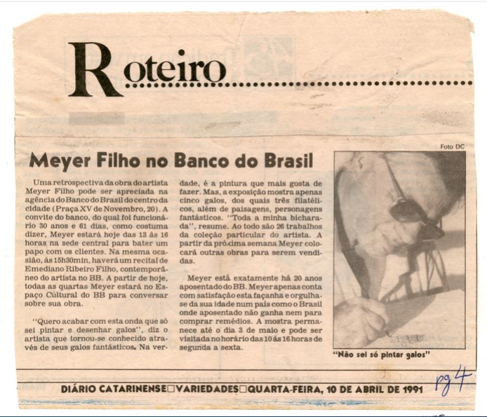 Recorte, aderido a papel sulfite, de Jornal Diário Catarinense, p.4, Caderno de Variedades, Coluna Roteiro, com destaque para matéria intitulada "Meyer Filho no Banco do Brasil". Possui fotografia de Meyer Filho e inscrição em caneta esferográfica azul.