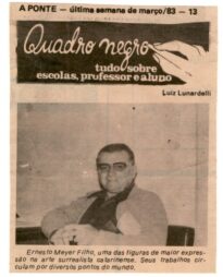 Coleção Coleção Instituto Meyer Filho Item MF.02256 17/11/2022 por Anna Serafim   Documento MF.02256 Baixar Metadados Miniatura Nº de registroMF.02256Localização no InstitutoMAPOTECA 1 - GAV. 8 - PASTA 10ColeçãoIII. PeriódicosTipoJornalTítuloA Ponte (SC) 1983AutoriaNILocal*Florianópolis (SC)Data Década 1980 Ano 1983 Mês e ano Março de 1983 DescriçãoRecorte de jornal, aderido a uma folha sulfite, de março de 1983 com destaque para a seção "Quadro negro: tudo sobre escolas, professor e aluno" de Luiz Lunardelli com reprodução fotográfica de Meyer Filho.IndexadoresA Ponte | Luiz LunardelliDimensão9,6 x 12,2 cmSuportePapel jornalTécnicaImpressão sobre papel jornalBordaNão se aplicaColorNão se aplicaEstado de conservaçãoBomDanos causados porAmarelecimento | Manchas | Sujidades | Vincos e dobrasProcedimentosAcondicionado | Digitalizado | HigienizadoForma de aquisiçãoLicença de uso de direitos autorais gratuitaProcedência*Família Meyer FilhoData de aquisição Data NI Registrado porAnna Julia Borges SerafimData de registro27/10/2022Condições de ReproduçãoTodos os direitos reservados. Para utilização da imagem solicitar autorização ao Instituto Meyer Filho. Continue navegando MF.02255 MF.02258 Voltar para a página de itens