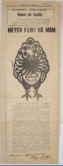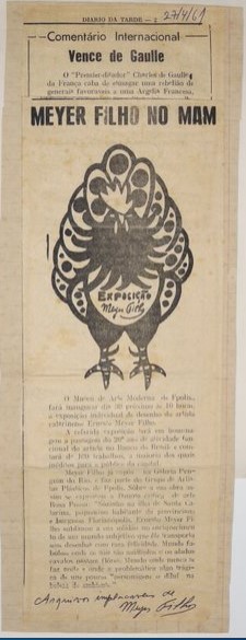 Recorte de jornal de 27/04/1961 com matéria intitulada "Meyer Filho no MAM" sobre exposição no Museu de Arte Moderna (MAM). Possui reprodução de desenho do artista e inscrição com comentário "Arquivos implacáveis de Meyer Filho". Possui fotocópia MF.02468.1 (14,6 x 40,2 cm)