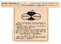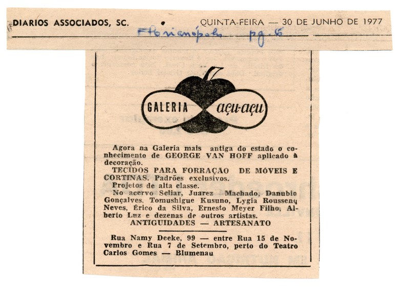 Coleção Coleção Instituto Meyer Filho Item MF.02474 30/11/2022 por Ana Julia Patricio   Documento MF.02474.1.1 Baixar Metadados Miniatura Nº de registroMF.02474Localização no InstitutoMAPOTECA 1 - GAV. 8 - PASTA 14ColeçãoIII. PeriódicosTipoJornalTítuloDiários Associados de Santa Catarina 1977 - com grifoAutoriaNILocal*Florianópolis (SC)Data Data 30/06/1977 Década 1970 Ano 1977 DescriçãoRecorte de jornal de 30/06/1977 com trecho sobre galeria açu-açu. Apresenta inscrição do artista "Florianópolis pg.6" . Possui exemplar MF.02474.1.1IndexadoresDiários Associados de Santa Catarina | Galeria Açu-Açu | Jornal | Meyer FilhoDimensão15,7 x 11 cmSuportePapel de jornalTécnicaImpressão sobre papel jornalBordaNão se aplicaColorNão se aplicaEstado de conservaçãoBomDanos causados porAmarelecimento | Oxidação | Vincos e dobrasProcedimentosAcondicionado | Digitalizado | HigienizadoForma de aquisiçãoLicença de uso de direitos autorais gratuitaProcedência*Família Meyer FilhoData de aquisição Data NI Registrado porAna Julia Vieira PatrícioData de registro30/11/2022Condições de ReproduçãoTodos os direitos reservados. Para utilização da imagem solicitar autorização ao Instituto Meyer Filho. Continue navegando MF.02473 MF.02475 Voltar para a página de itens