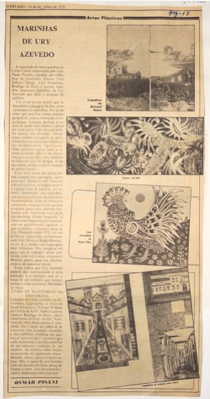 MF.02492.12 Recorte de jornal de 24/12/1978, p. 19, coluna “Artes Plásticas” assinada por Osmar Pisani, com matéria intitulada “Marinhas de Ury Azevedo" e reprodução de obra do artista. Possui parte inscrição do número da página (18,3 x 35,9 cm).