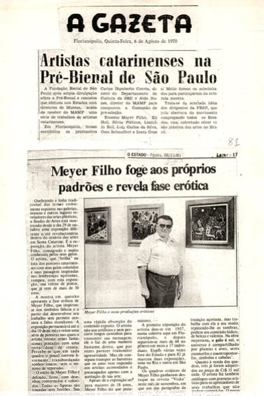 MF.02495.7 Fotocópia de jornal de 06/11/1981 com matéria intitulada "Meyer Filho foge dos próprios padrões e revela fase erótica. Possui fotografia do artista com sua obra. Apresenta acima fotocópia do jornal A Gazeta em 06/08/1970 com matéria intitulada "Artistas catarinenses na Pré-Bienal de São Paulo", com original já cadastrado no item MF.02313.7 (32,8 x 21,6 cm)