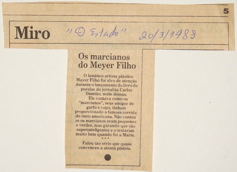 MF.02500.1 Recorte de jornal de 20/03/1988, com matéria intitulada "Os marcianos do Meyer Filho" sobre o artista no lançamento do livro de poesias do jornalista Carlos Damião. Possui inscrição feita pelo artista "O Estado 20/3/1988" (17,3 x 12,4 cm)