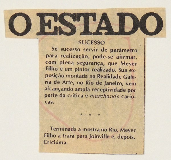 Coleção Coleção Instituto Meyer Filho Item MF.02503 06/12/2022 por Ana Julia Patricio   Documento MF.02503 Baixar Metadados Miniatura Nº de registroMF.02503Localização no InstitutoMAPOTECA 1 - GAV. 8 - PASTA 8ColeçãoIII. PeriódicosTipoJornalTítuloO Estado (SC) Sem data - com grifoAutoriaNILocal*Florianópolis (SC)Data Década Sem data DescriçãoRecorte de jornal com trecho intitulado "Sucesso" sobre realizações do pintor Meyer Filho e sua exposição na Realidade Galeria de Arte no Rio de Janeiro . Possui circulo destacando todo o trecho em caneta rosaIndexadoresExposição | Meyer Filho | O Estado | Realidade Galeria de ArteDimensão9,1 x 8,1 cmSuportePapel de jornalTécnicaImpressão sobre papel jornalBordaNão se aplicaColorNão se aplicaEstado de conservaçãoRegularDanos causados porAmarelecimento | Manchas | SujidadesProcedimentosAcondicionado | Digitalizado | HigienizadoForma de aquisiçãoLicença de uso de direitos autorais gratuitaProcedência*Família Meyer FilhoData de aquisição Data NI Registrado porAna Julia Vieira PatrícioData de registro06/12/2022Condições de ReproduçãoTodos os direitos reservados. Para utilização da imagem solicitar autorização ao Instituto Meyer Filho. Continue navegando MF.02497 MF.02499 Voltar para a página de itens