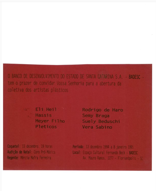 Convite para coletiva de artistas plásticos ocorrida de 13 de dezembro de 1994 a 8 de janeiro de 1995 no Espaço Cultural Fernando Beck - BADESC em Florianópolis (SC) com participação de obras de Meyer Filho. Possui outro exemplar: MF.02616.1.